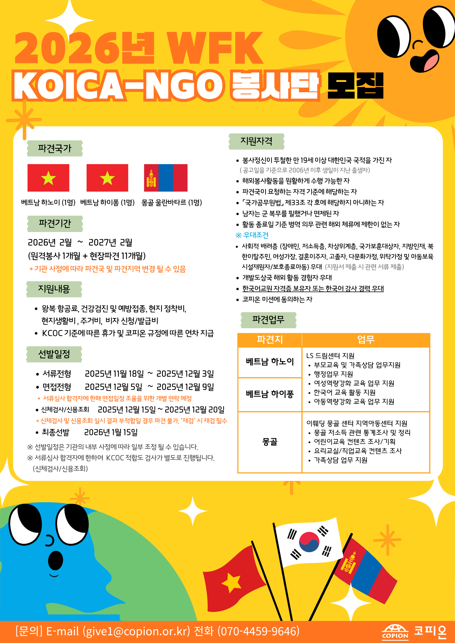 – 모집인원 : 3명 (베트남 하노이 1명, 베트남 하이퐁 1명, 몽골 울란바타르 1명)